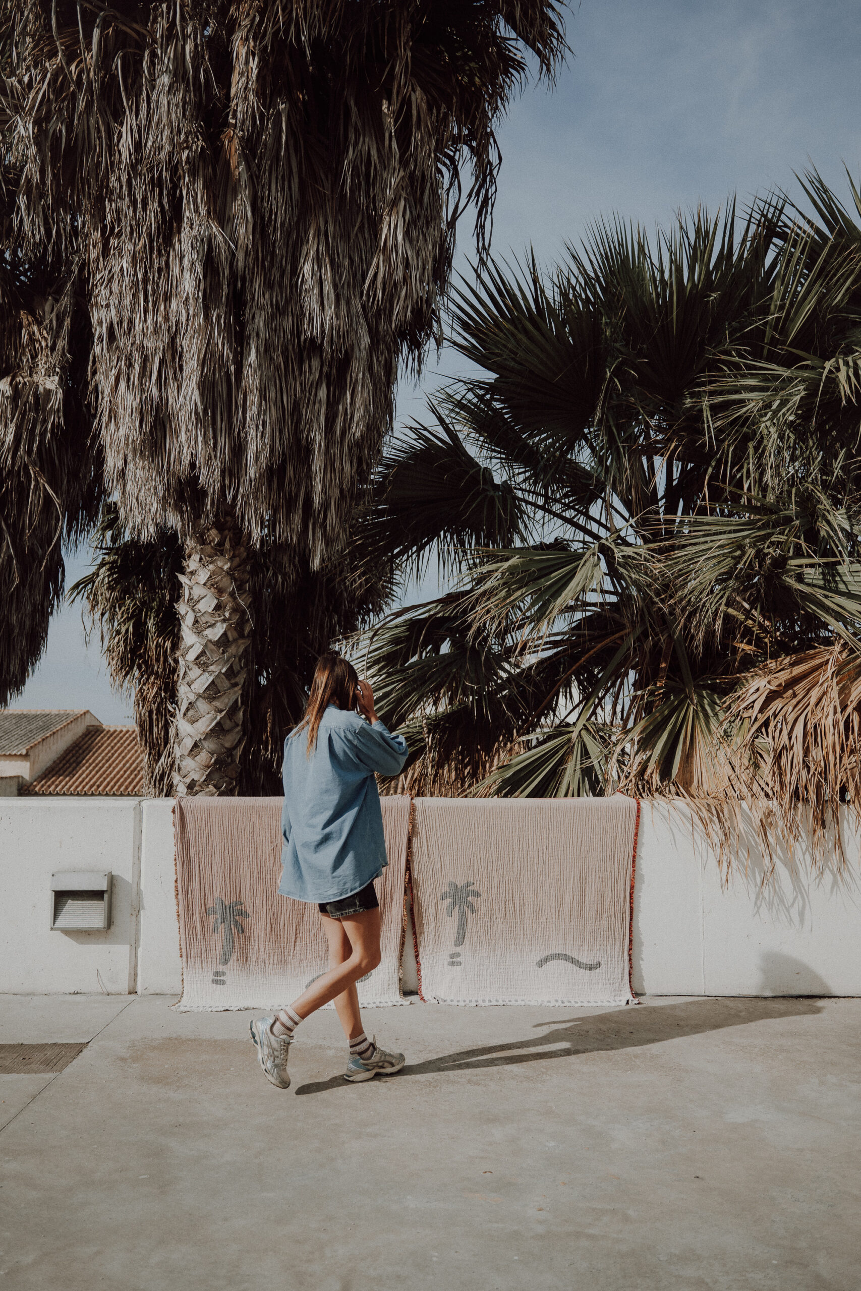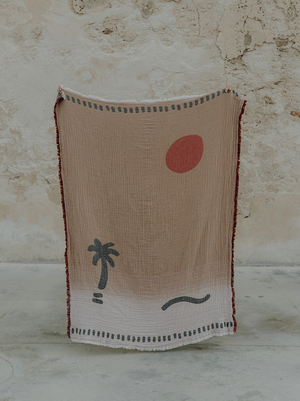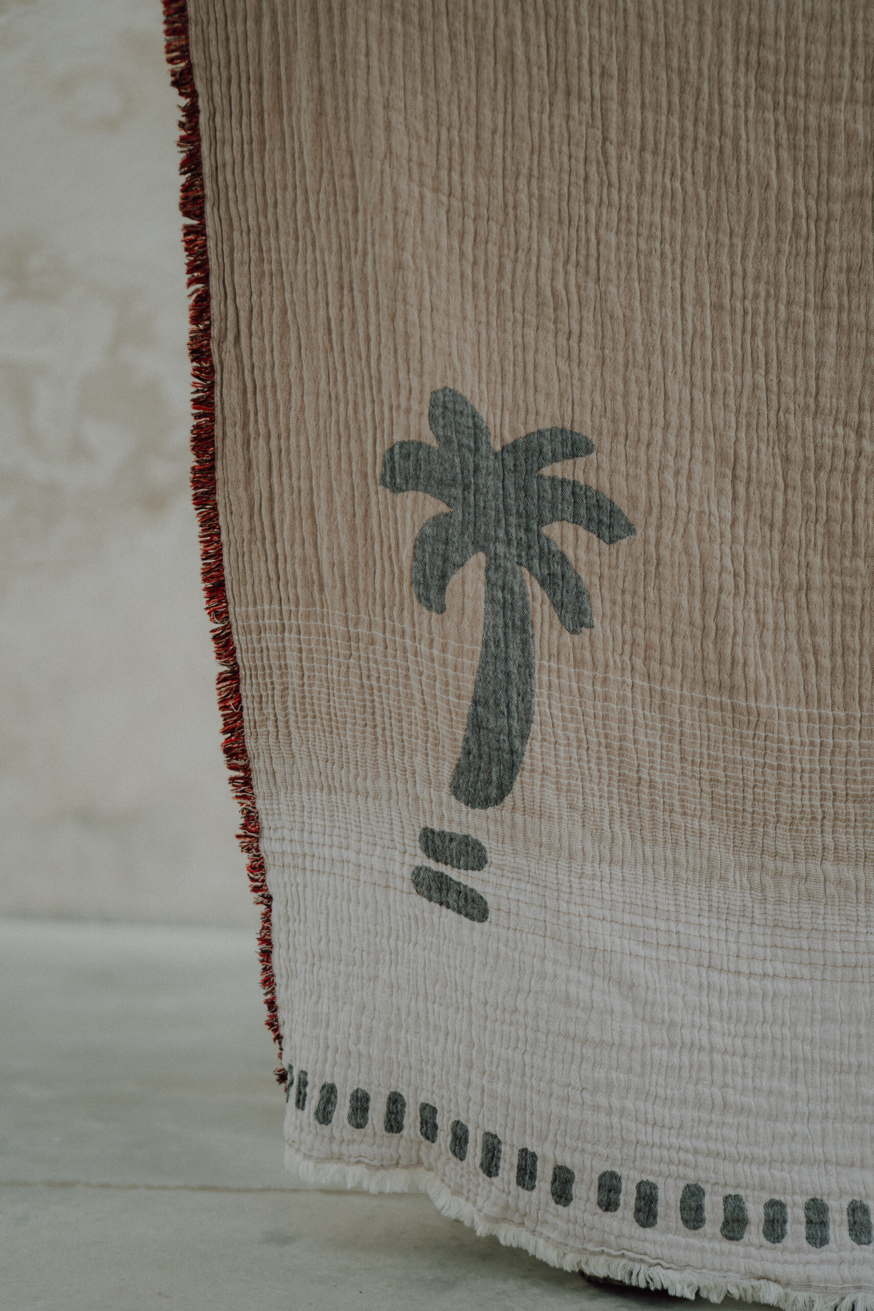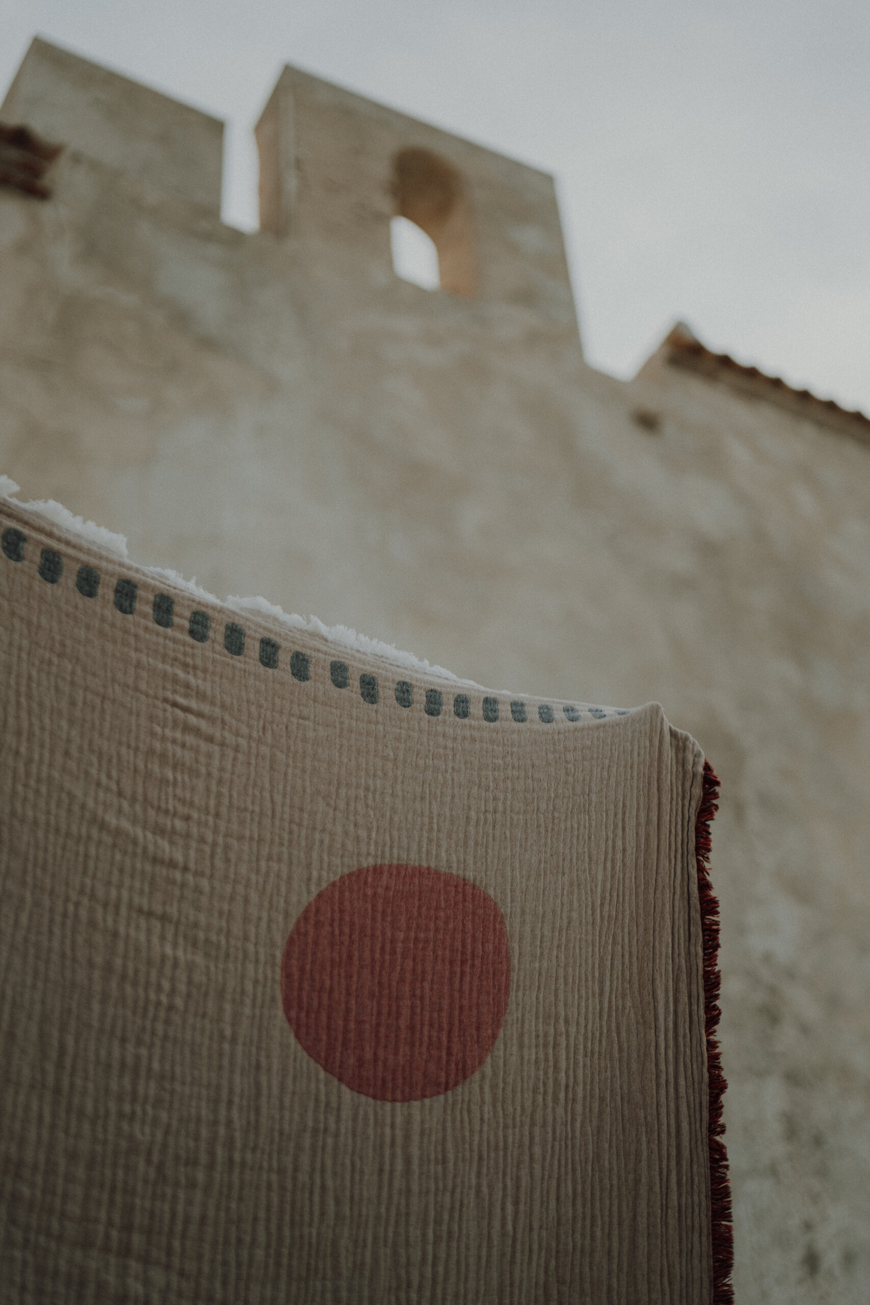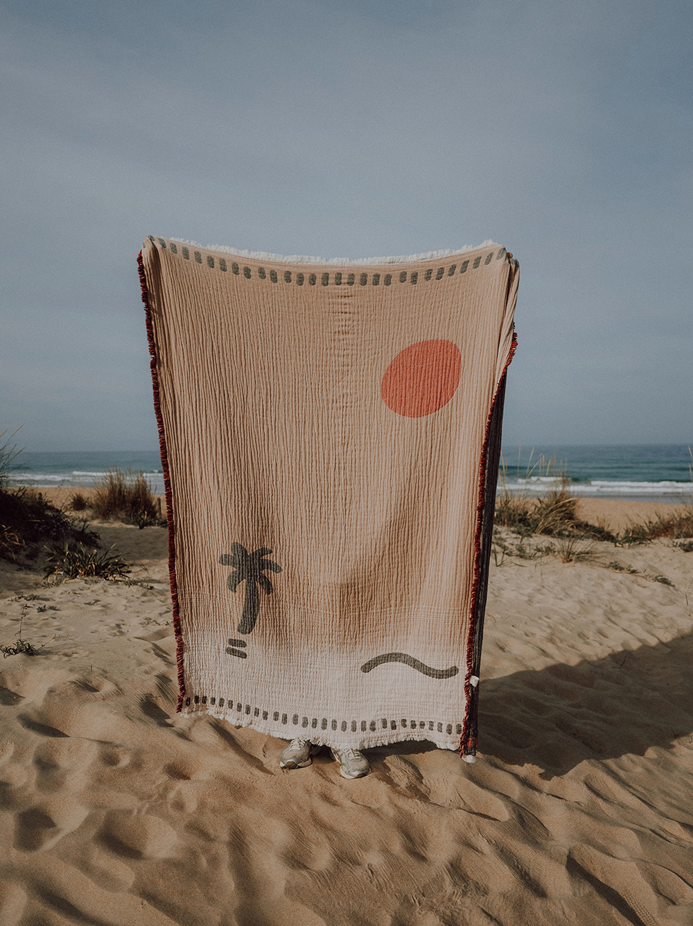 Beach blanket with tassels. 100% cotton. Ideal as a lightweight summer blanket or bedspread. It can also serve as a holiday towel – it absorbs water well and dries quickly.