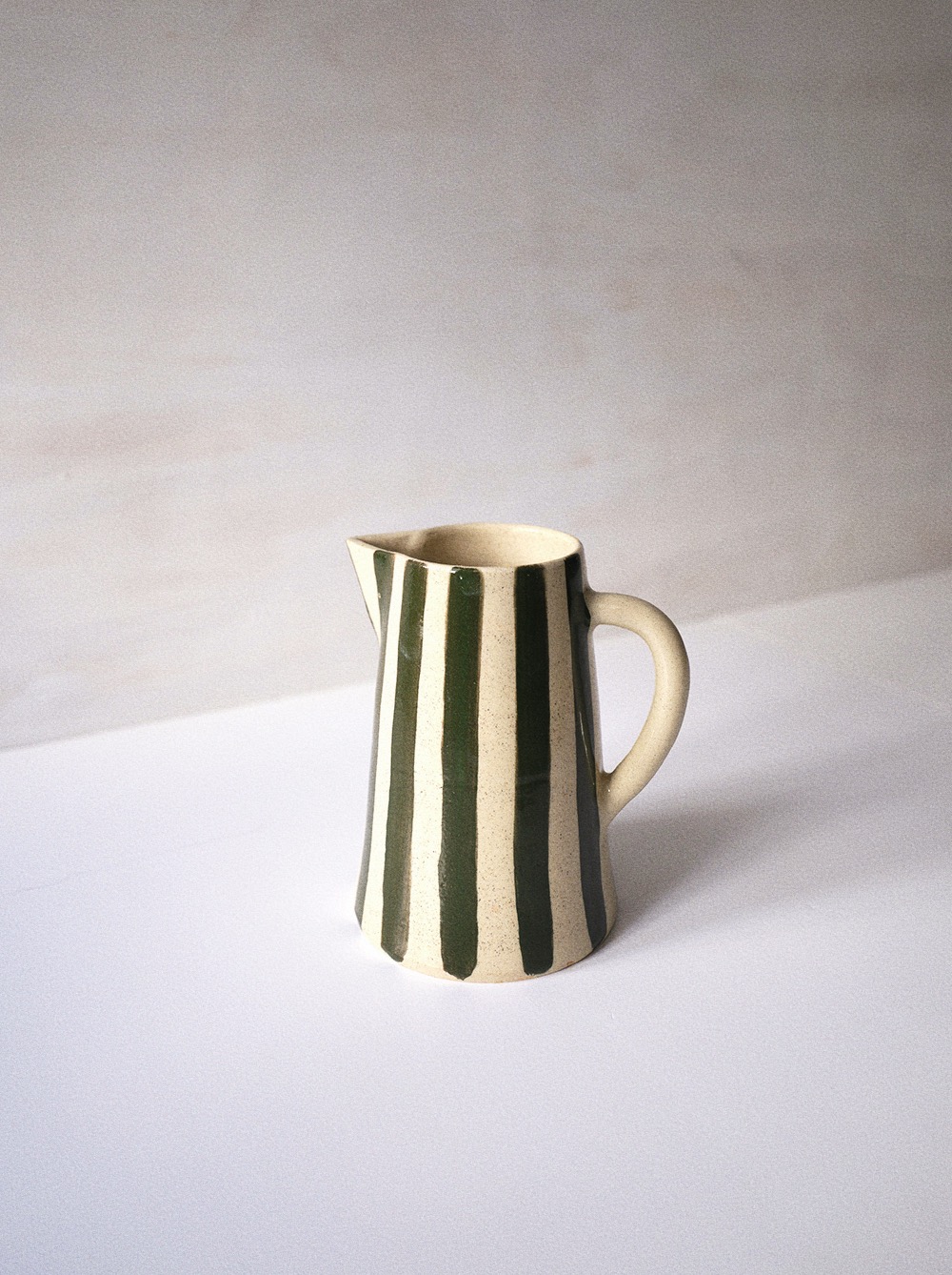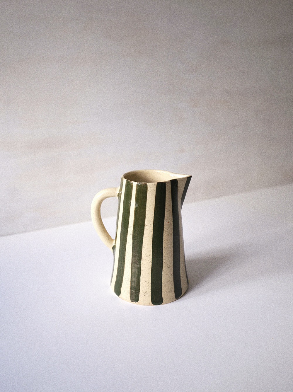 Handmade stoneware jug made from beige clay with tiny black speckles. Hand painted and coated in matte clear glaze.