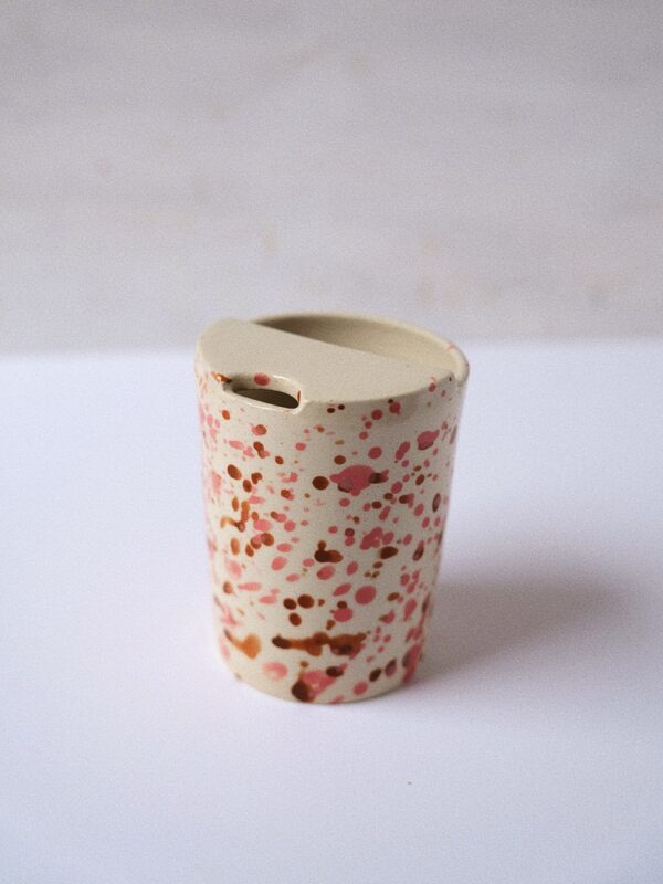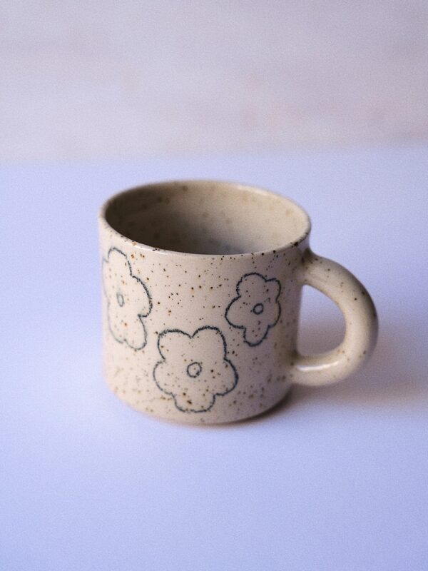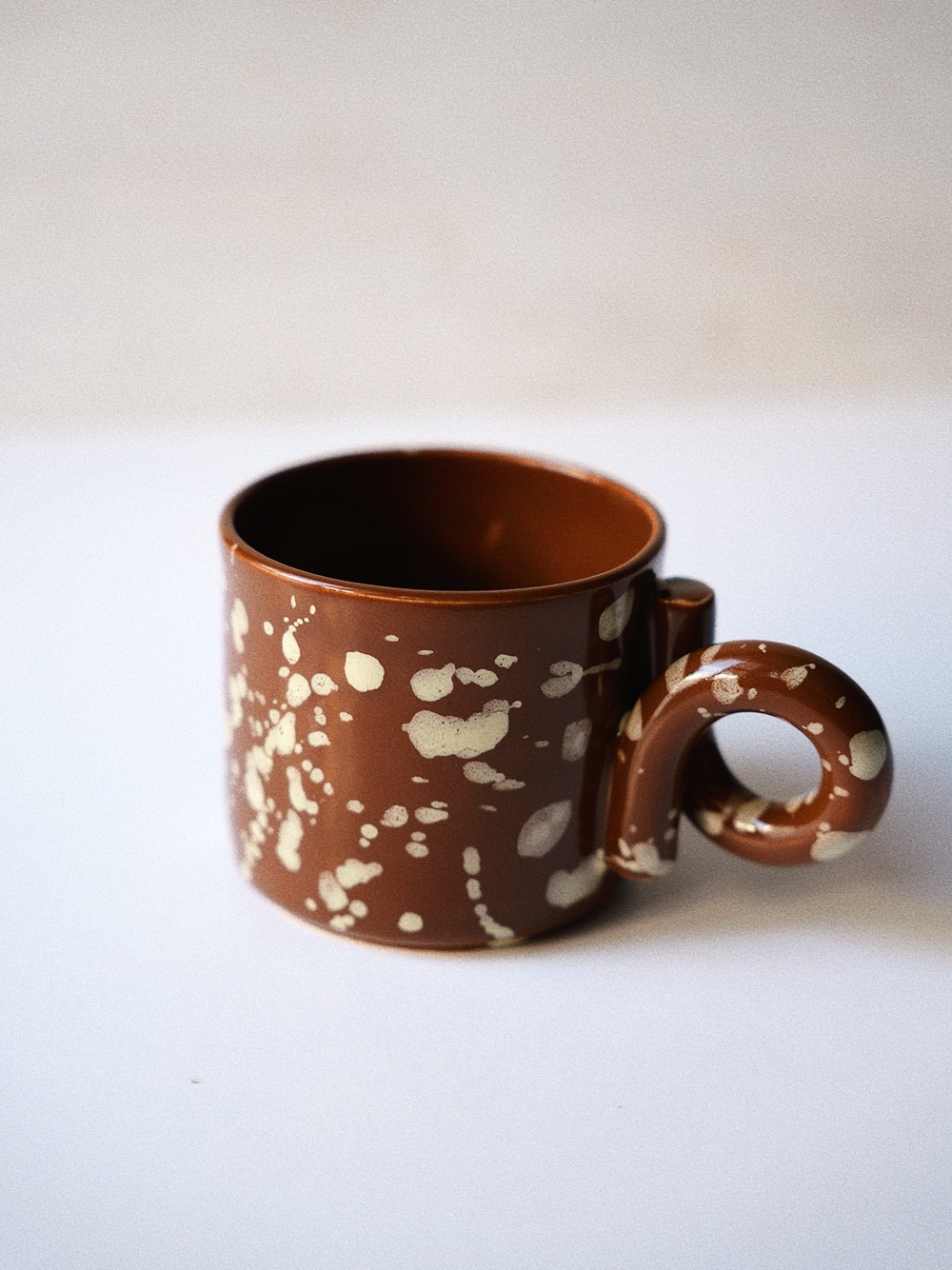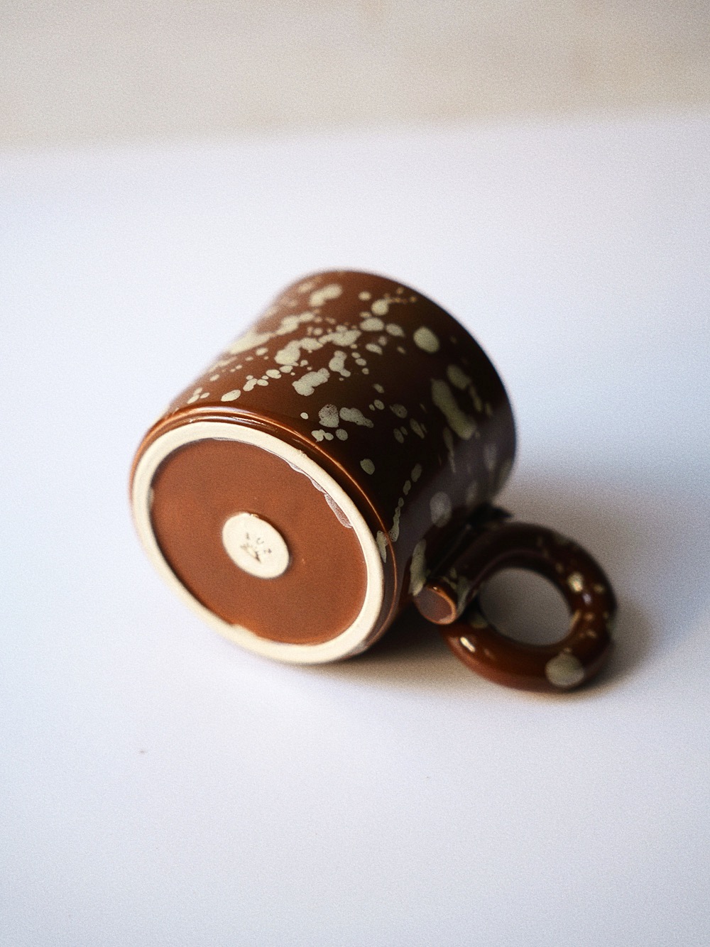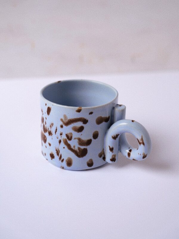 Handmade stoneware mug made from light beige clay, handpainted and coated in brown glossy glaze.
